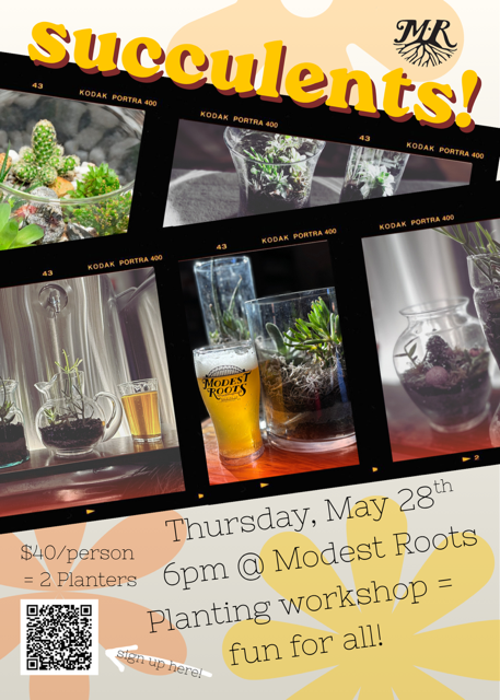 Back to All Events Succulent Planting with Dalton Thursday, May 28, 2026 6:00 PM 8:00 PM Modest Roots Brewing Company 45 Middlesex Road Tyngsborough, MA, 01879 United States (map) Google Calendar ICS Come join us for this fun event and let Dalton guide you through through the process of creating beautiful succulent planters! Sign up with the QR code on the picture!
